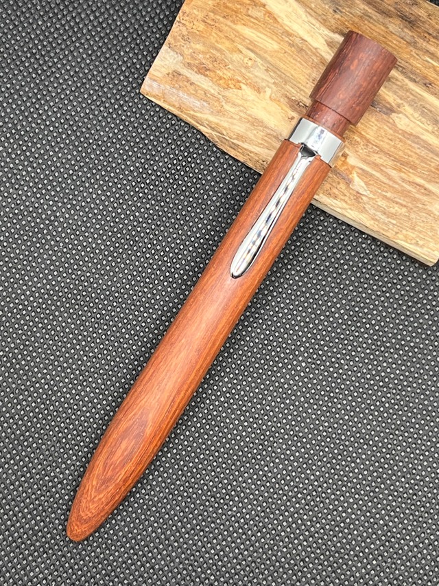 Ramus-KT (ラームス) 樹 種: 本紫檀 金 具: KATO金具 仕 上: 未晒し蜜蝋ワックス(亜麻仁油×蜜蝋) 全 長: 約 135mm 最大径: 約 13mm 重 さ: 約 30g 対応芯: G2規格リフィル デフォルトの芯としてジェットストリーム ボール径0.5mm(SXR-600-05)を装着しております。 また、付属品として小分けした蜜蝋ワックス(約5g)が同梱します。 【注意点】 ・口金部分が軸と一体化しております。持ち手部分に重心パーツ(重り)が仕込んでありますが、口金の金属パーツが無いため重心が中央、若干ノック側にあります。使用者様によっては通常のペンよりも筆記しにくい可能性があります。 ・BPのみ対応しております。MPの装着は不可です。 ・本品は手作り品です。完璧を求められる方は購入をお控えください。